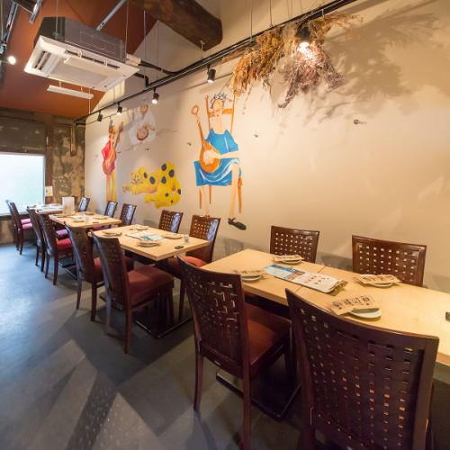 【テーブル席】壁一面に描かれたアートが彩る空間で、非日常のひとときを。大切な友人との食事やデートに最適な空間です♪