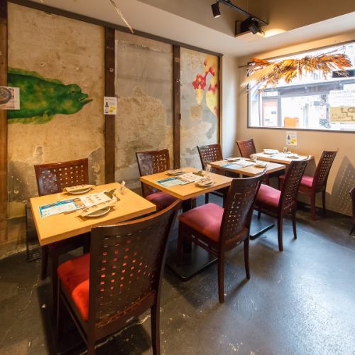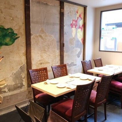 【テーブル席】壁のユニークなイラストが目を引くテーブル席は、女子会や友人同士の食事に最適。気軽に賑やかなひとときを過ごせます!