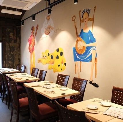 壁一面に描かれた個性的なイラストに囲まれた店内は、女子会やデートに最適!駅近なので気軽に立ち寄れます
